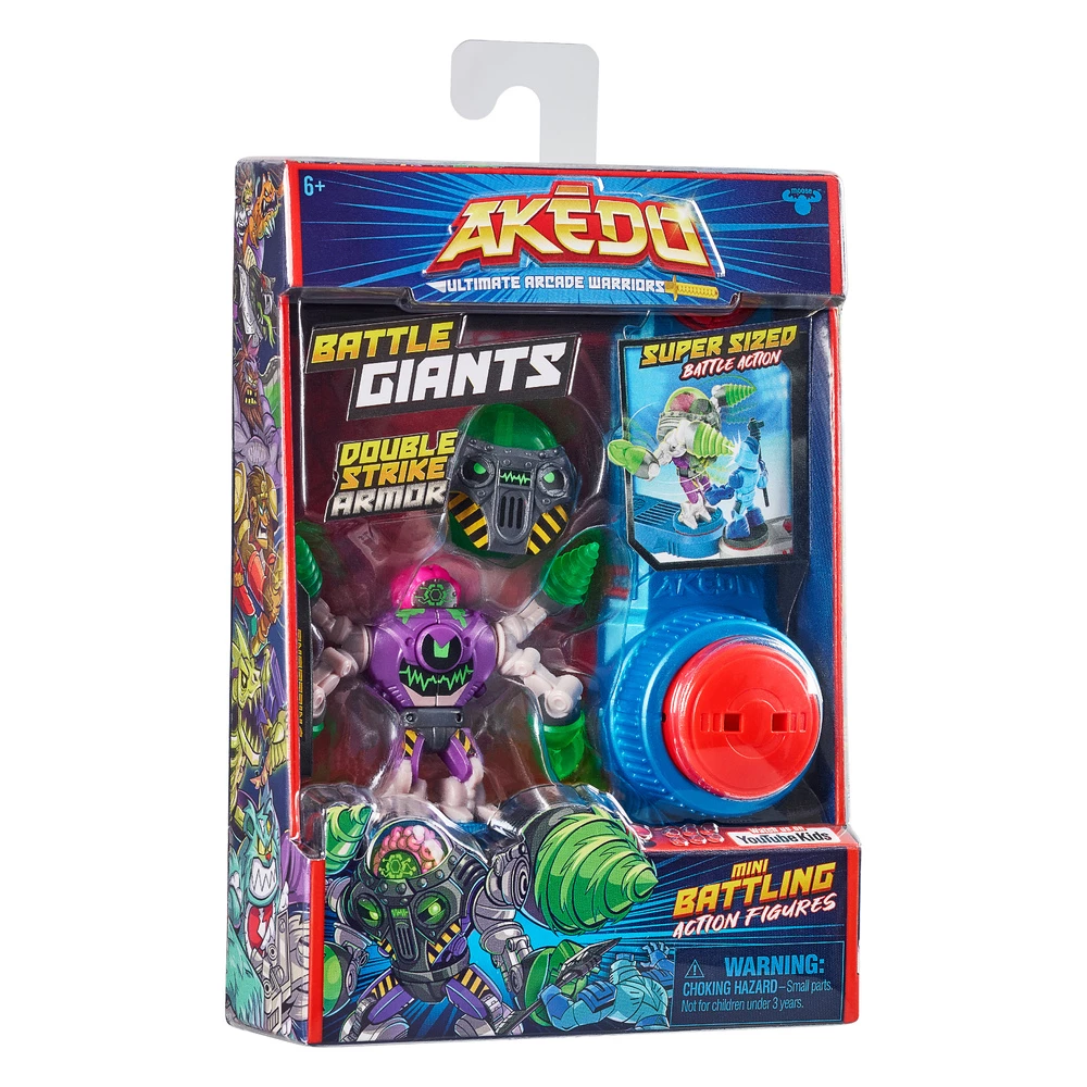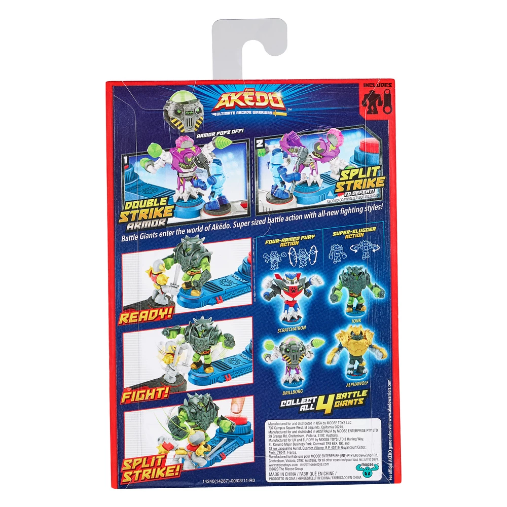 Prepare for all new supersized battle action with Akedo Battle Giants. These Arcade Warriors have double the defence with double strike armor! Hit them once to remove their armor then hit them again with a Split-Strike! There are also 2 new fighting styles – four-armed fury action and super slugger action – to level up your skill and strategy. Collect all 4 new Battle Giants!
