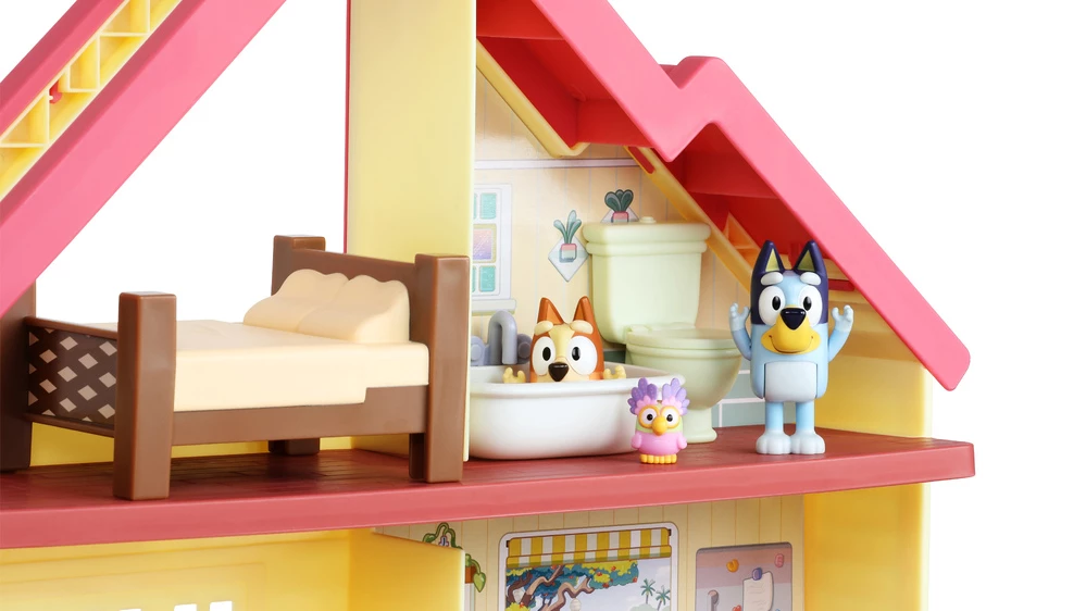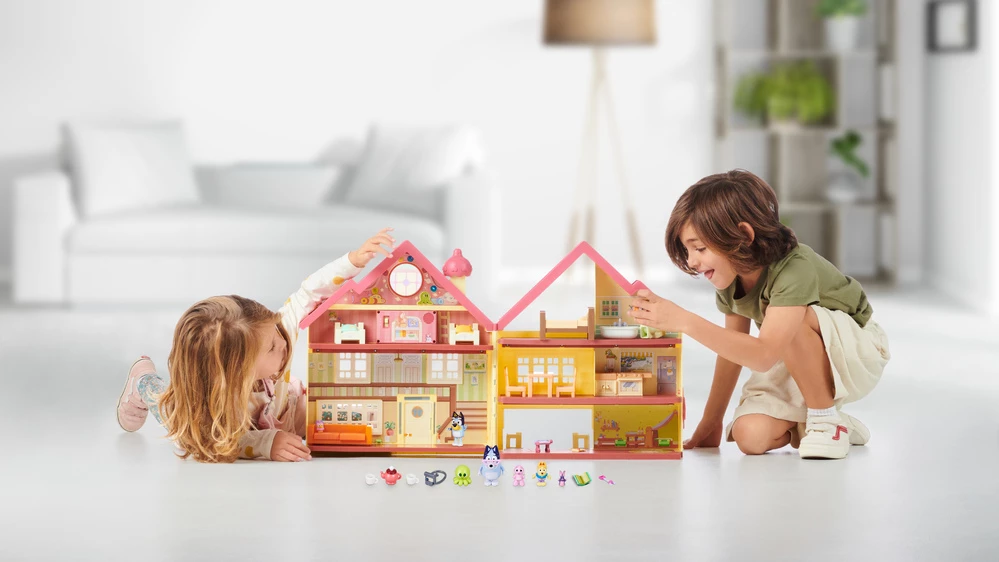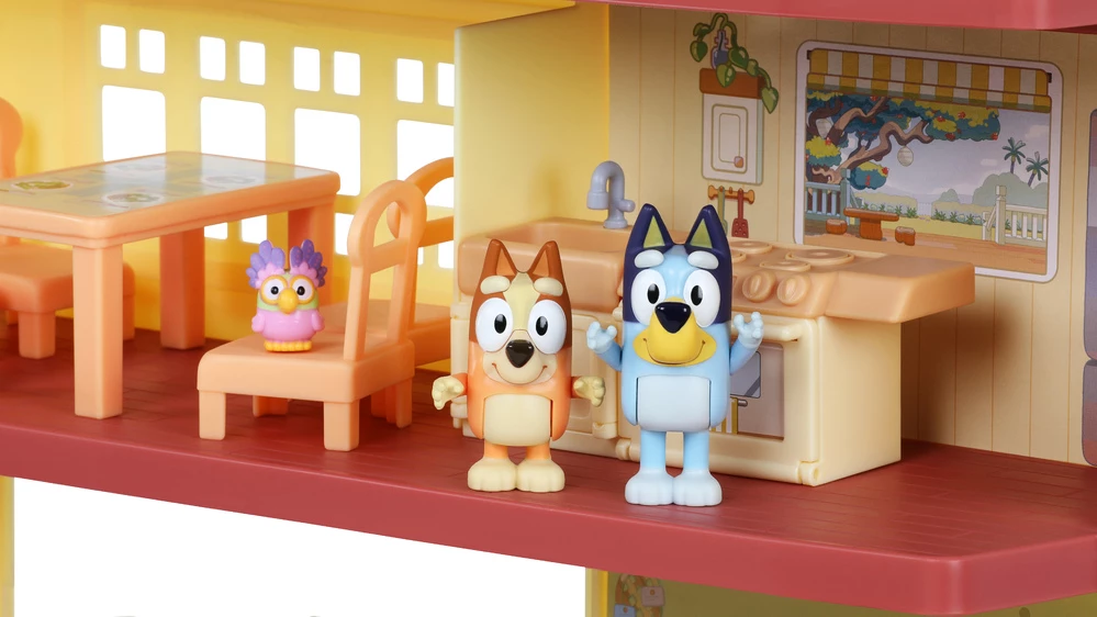 The Bluey Ultimate Lights & Sounds Playhouse is huge at a whopping 43cm tall and 76cm wide when you open it up! Feature-packed, this Playset comes fully furnished with the same furniture seen on the TV show! There are three stories to explore. Bluey’s House comes to life when you press the Octopus in the kid’s room to activate lights and over 50 sounds and phrases! There is even a moving Dancefloor! Attach your Figures and move the Lever to recreate the opening dance scene of the show! The Bluey Ultimate Lights & Sounds Playhouse includes 6.5cm and 7.5cm Figures of Bingo and Bluey plus Chattermax! When you’re finished for the day, pack in the 15 accessories and fold it all away!