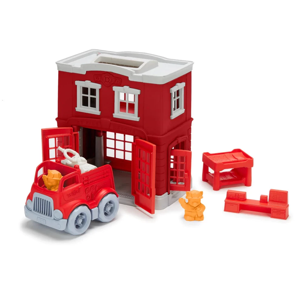 Spark imaginative play with the Green Toys™ Fire Station! This playset has everything your little firefighter needs to save the day, including a fire station, fire engine, firefighter cat characters, rotating water cannon, command centre, and stackable bunk beds. Open and close the doors to both the front and back of the station, help the cats slide down the fire pole, and race to the rescue in the fire engine, all while helping to develop fine motor cooperative play skills. All pieces fit inside the fire station, so clean-up and storage is a breeze, and the built-in handle makes it easy to take all the fun on-the-go.