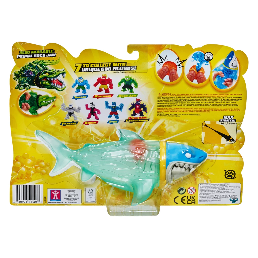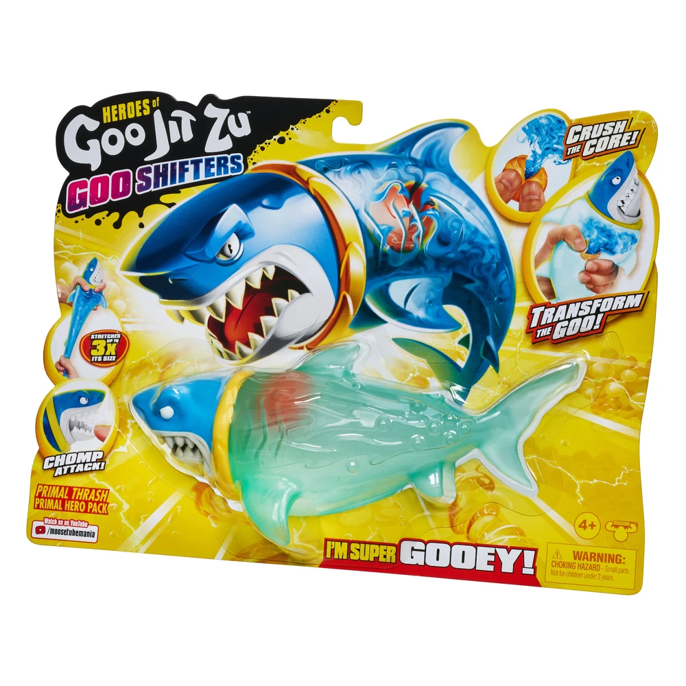 Prepare yourself for some Powered-up action! Your favourite stretchy, squishy hero Thrash has returned in his Primal Form and is ready to be powered-up by you! Crush Thrash’s Core to activate his “Goo-formation”! Watch as the Goo inside his body changes before your eyes to release his inner power! Thrash is back in his Primal Form of a shark! This awesome Goo Jit Zu toy features “Chomp Attack” Action! His huge teeth-filled jaws can open up wide for him to battle against Primal Rock Jaw! Both Primal Thrash and Primal Rock Jaw have a unique Goo Filling and “Goo-formation”! Thrash is Super Gooey! He can stretch up to three times his size and return back to his original shape. The Heroes of Goo Jit Zu need YOU! Transform the Goo and power-up with the Goo Shifters!