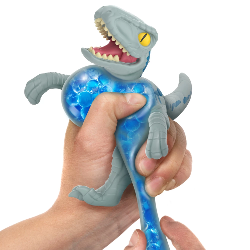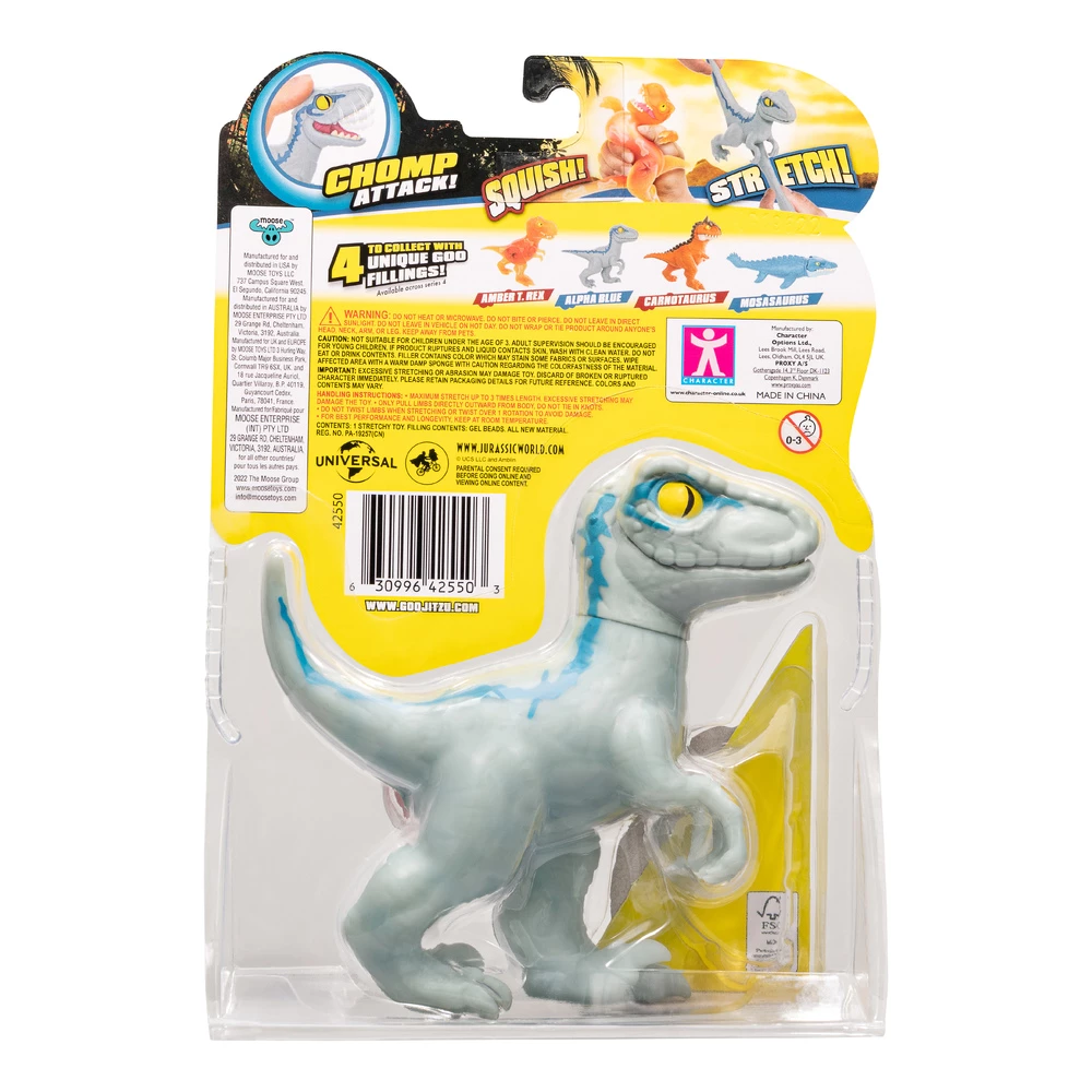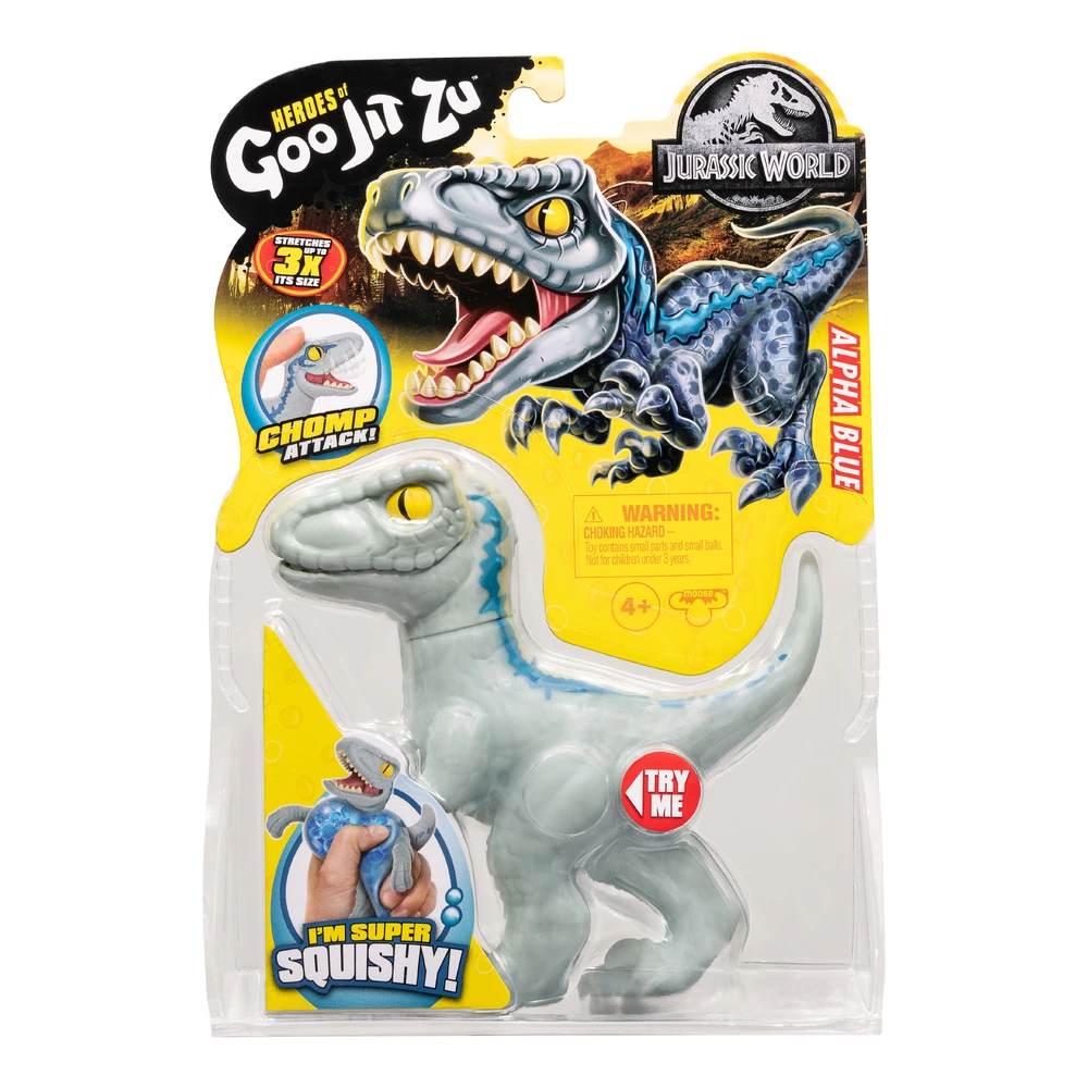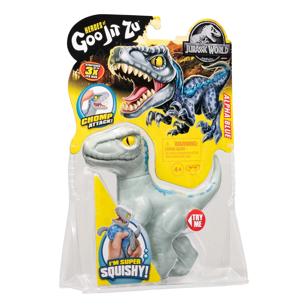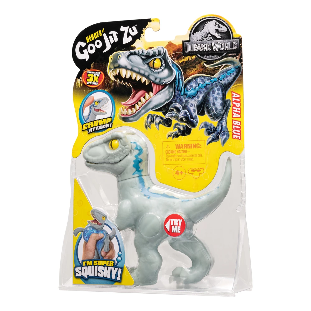Jurassic World Heroes of Goo Jit Zu are stretchy fun! Alpha Blue is Super Squishy! Grab and stretch the toy dino’s arms and legs. This incredible realistic, flexing dinosaur can stretch to 3 times its normal size! When you let Alpha Blue go, it returns back to its original shape and size! Each of these Jurassic World Heroes of Goo Jit Zu dinosaurs have an awesome “Chomp Action” with opening and chomping jaws! Alpha Blue has a unique goo filling with blue gel beads inside making them very squishy. Collect four Jurassic World dinosaurs: Alpha Blue, Amber T. Rex, Carnotaurus and Mosasaurus.