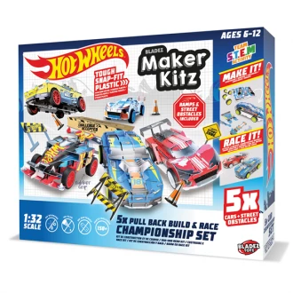 Pop out the plastic parts to build your Hot Wheels Car without scissors or glue. Once assembled the Car is robust and features double pull back motors for awesome high speed racing with no batteries. Car is also customisable with stickers. Includes 5 car body panels, 10 wheel and motor modules, 10 street accessories and 1 ramp.