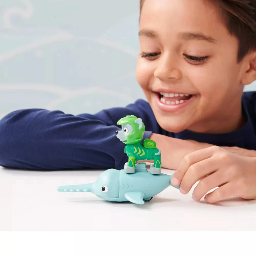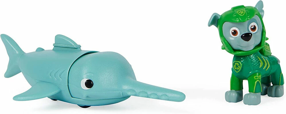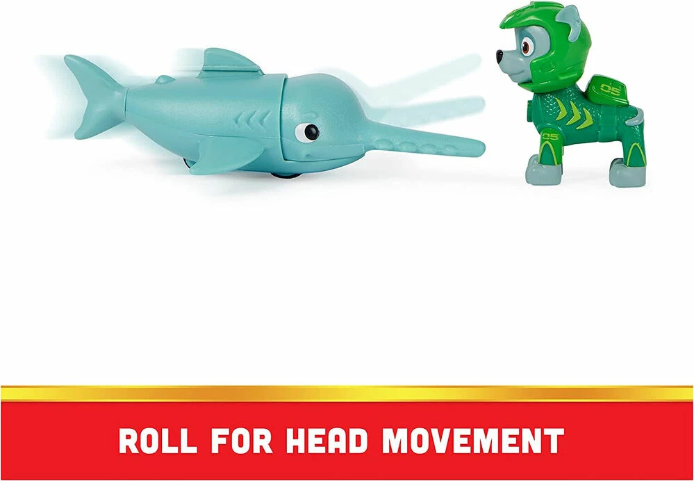 Team up with Rocky and his trusty Sawfish pal as they go on exciting missions in the pretend seas! Wearing his green Aqua Pups wetsuit, with true-to-show fish-scale details and a super cool divers helmet, Rocky is ready for exciting missions on the high seas and looks just like he does in the PAW Patrol: Aqua Pups Series! Rocky and his trusty Sawfish pal are ready for some high-speed rescue action! When there’s trouble afoot, place Rocky onto the fin on Sawfish’s back then roll them forward to activate his head-swipe action and save the day! Each pup comes with a different animal pal, so collect all the PAWsome pups and their aquatic friends (each sold separately) then use your imagination to create your own missions or relive your favorite scenes from the hit series over and over again!